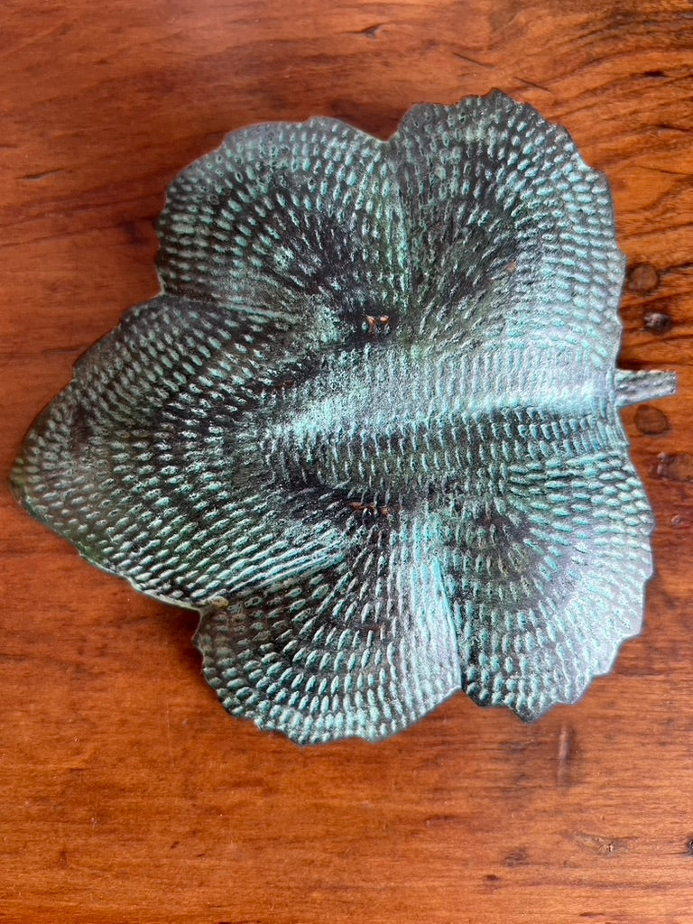 Maple or grape-leaf shaped dish, with a lovely verdigris patina. Could be used as decor, or a catchall or trinket dish.