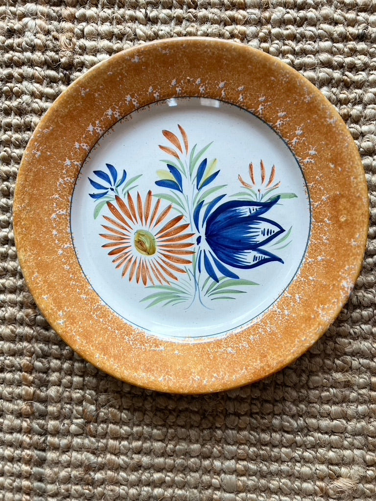 Vintage Henriot Quimper abstract orange spatter rim floral plate. Marked "Henriot Quimper, France, 101" on the underside.